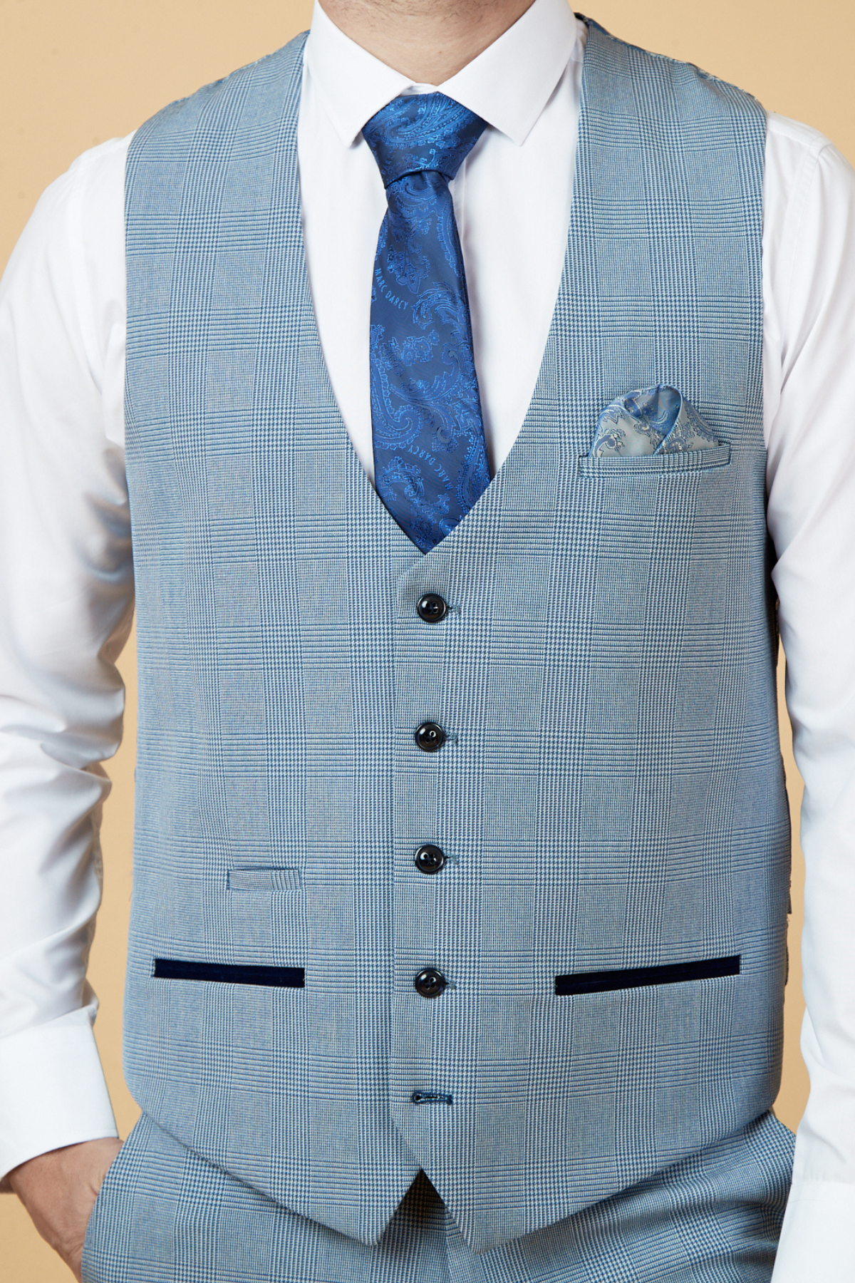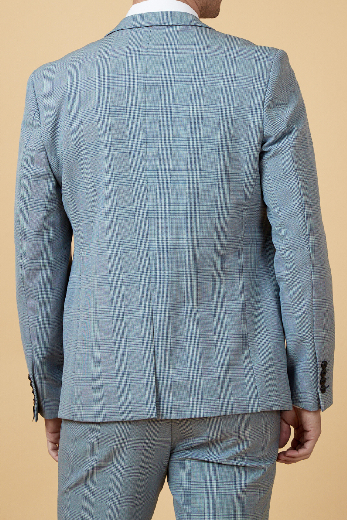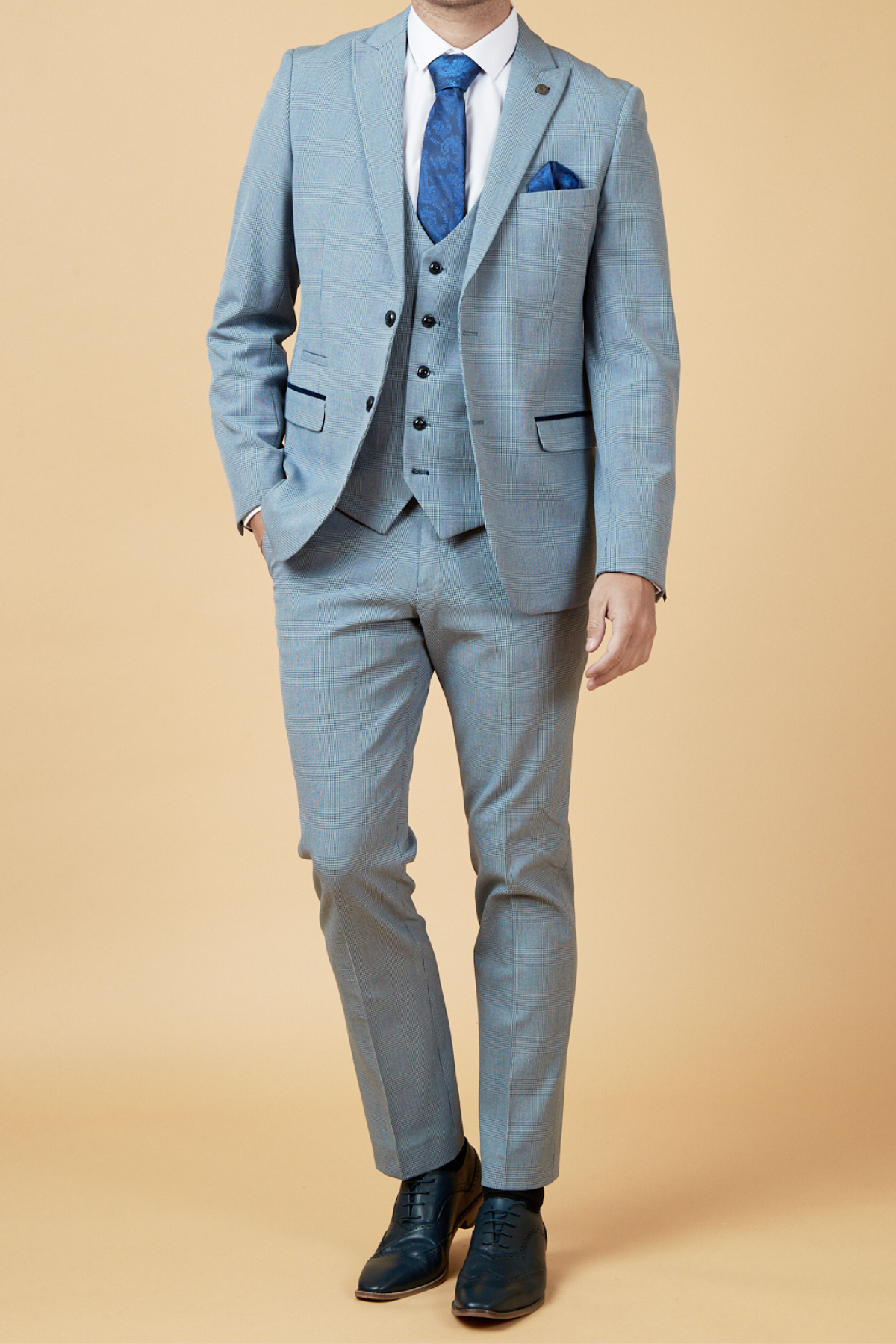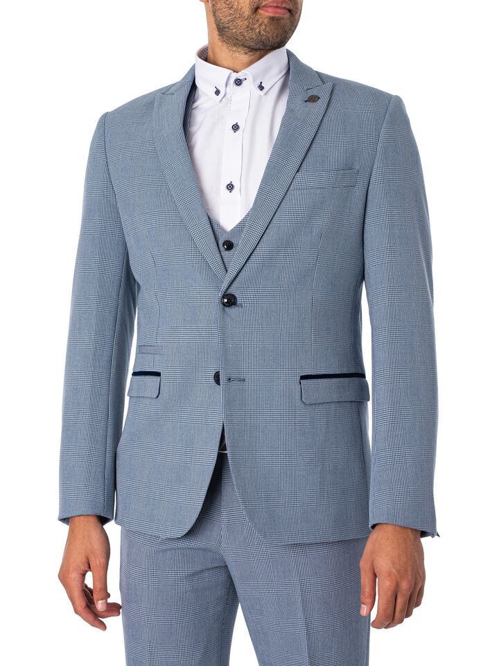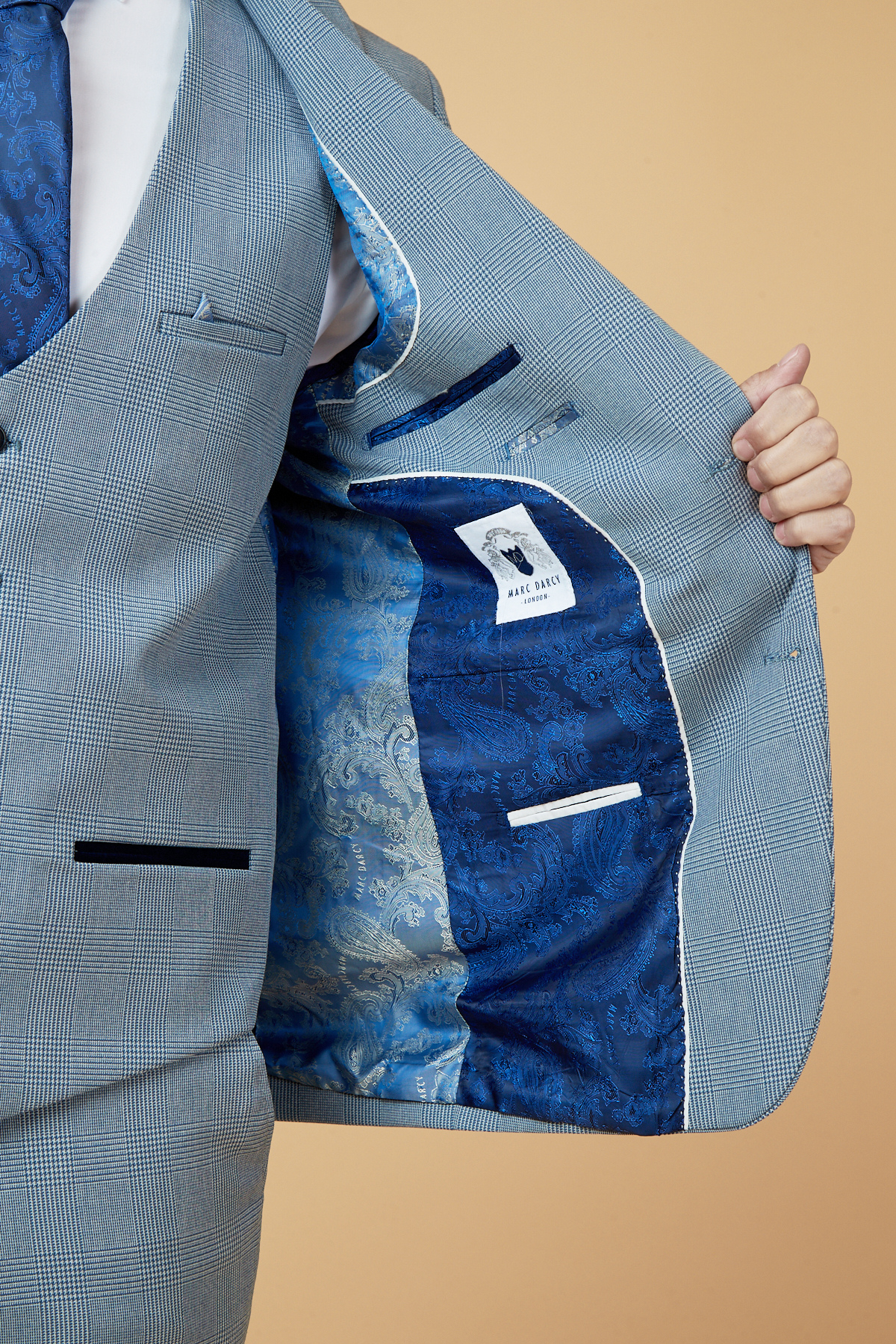 This sleek, men's three-piece suit will be a popular choice for weddings and special occasions. The Prince of Wales check pattern is a classic formal look, while the added elastane ensures comfort and flexibility all day. The sky blue colour coordinates beautifully with any formal event.