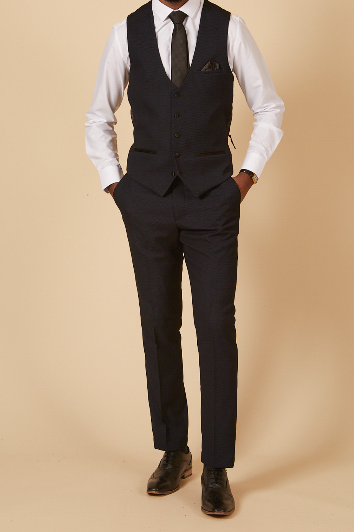 Kick off your special occasions with this Dalton three piece suit. With a classic silk style tuxedo peak lapel to the blazer and matching buttons, it is the perfect formal suit. Featuring a vibrant dual panelled lining with branded Marc Darcy circle print and a complimentary pocket square to match, this suit will turn heads at your next party.