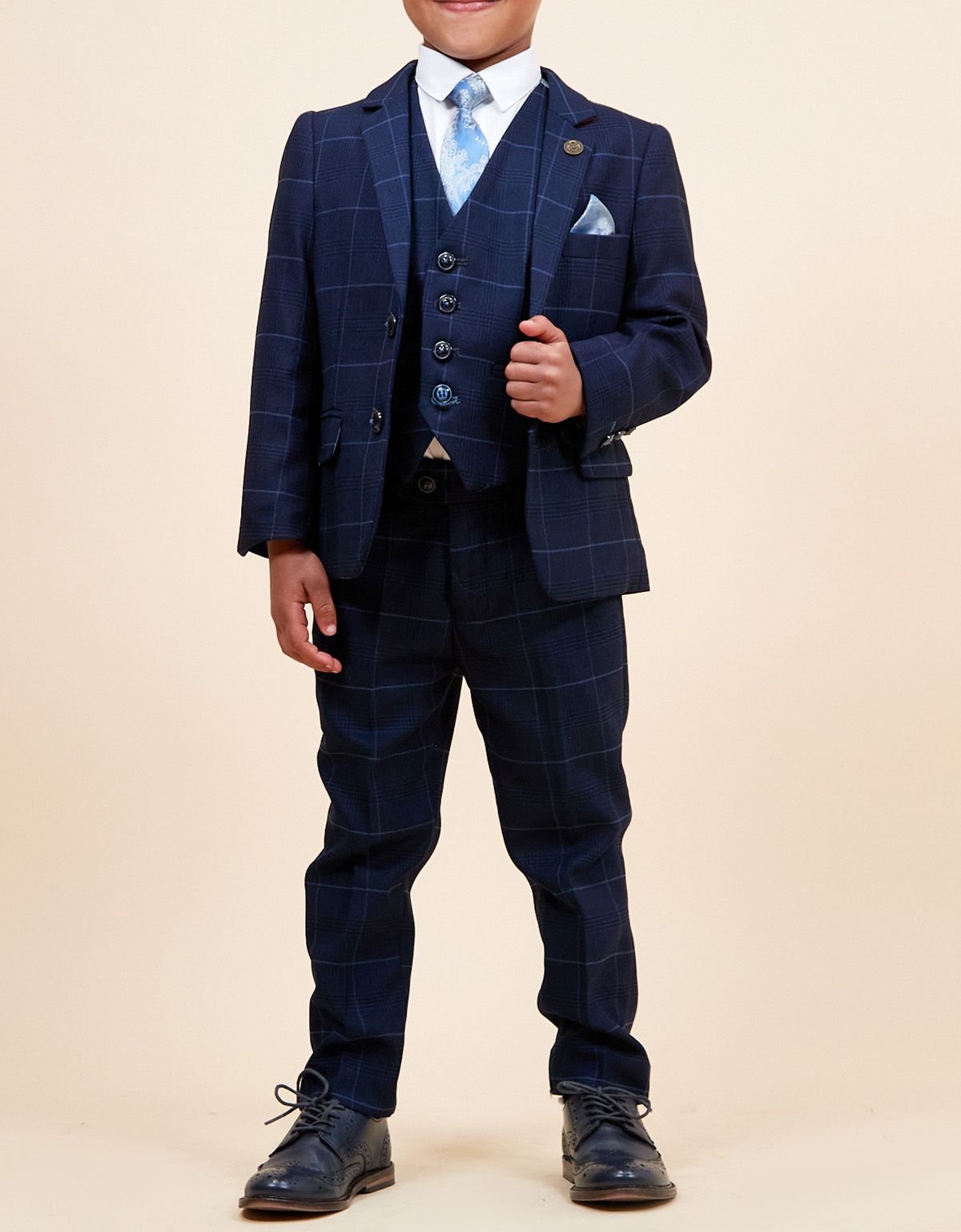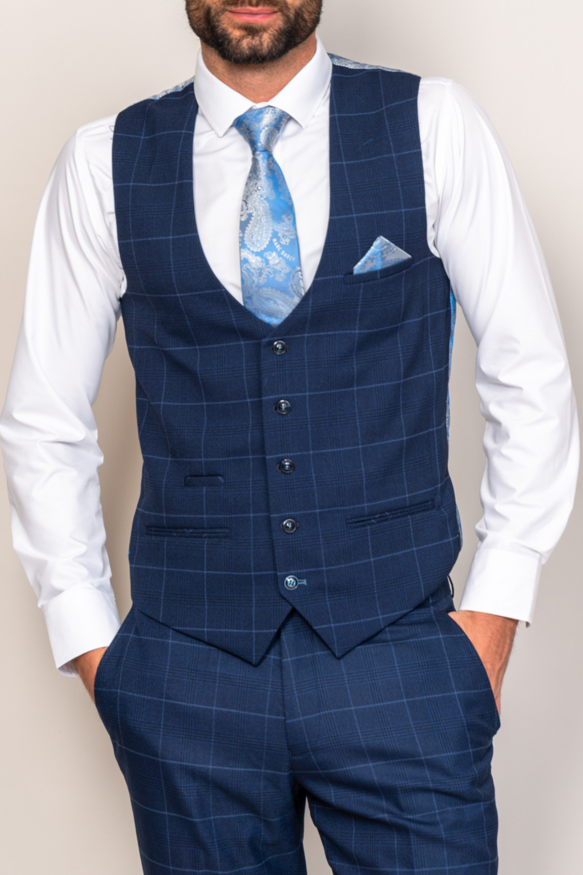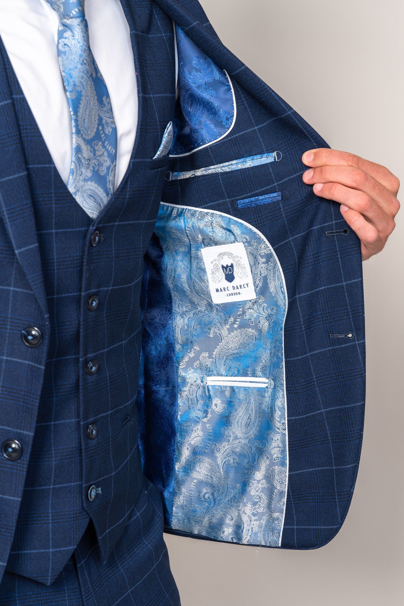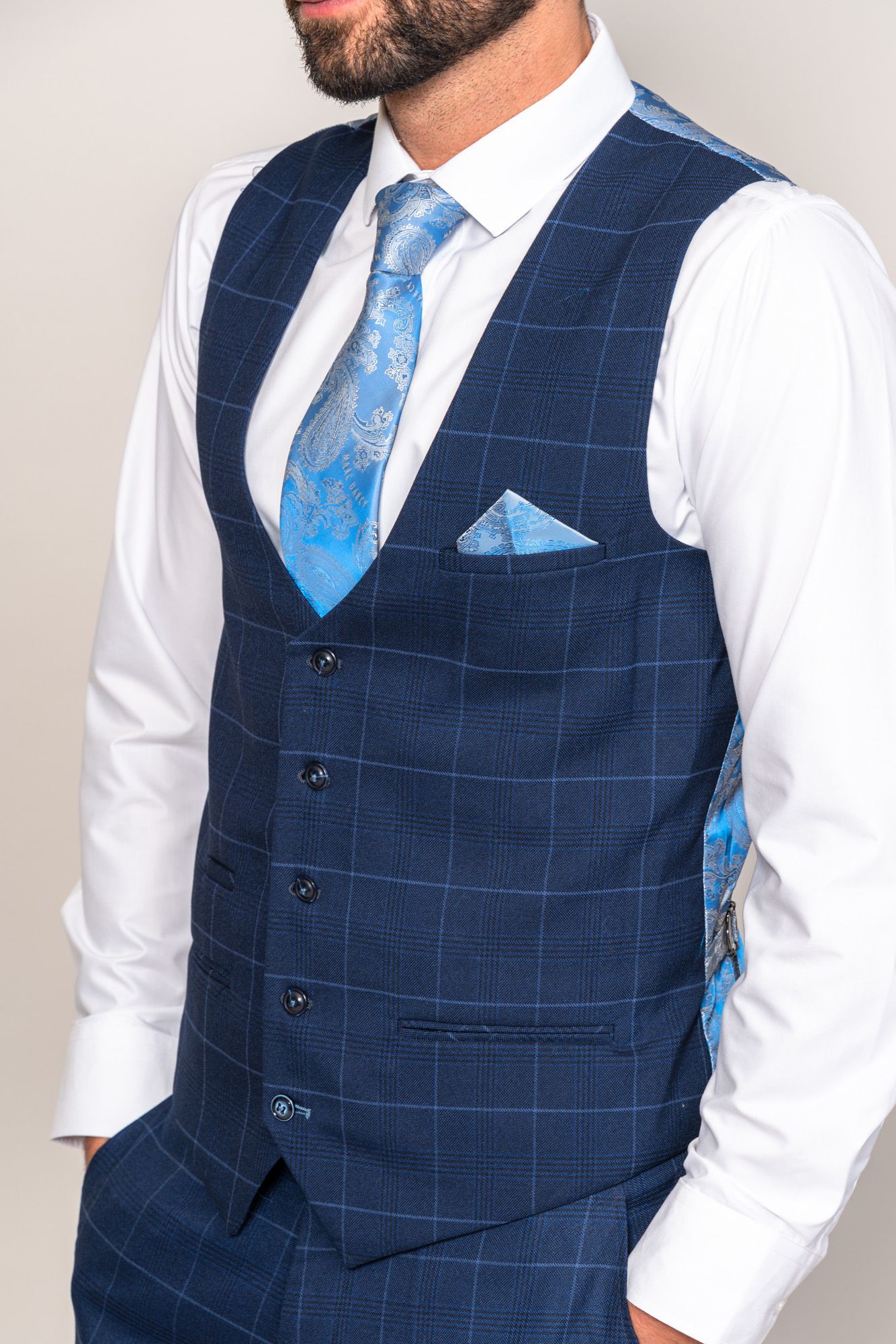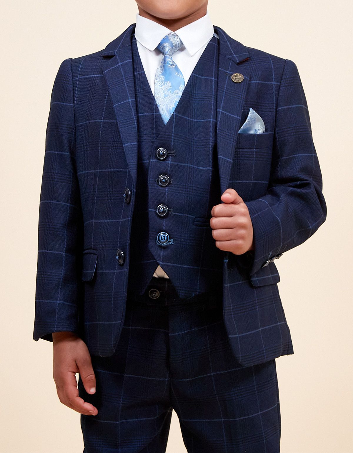 This men's navy check blazer is simple and sophisticated in its design, cut to a slim tailored fit, it features a delicate sky blue check laden on a subtle navy Prince of Wales check.