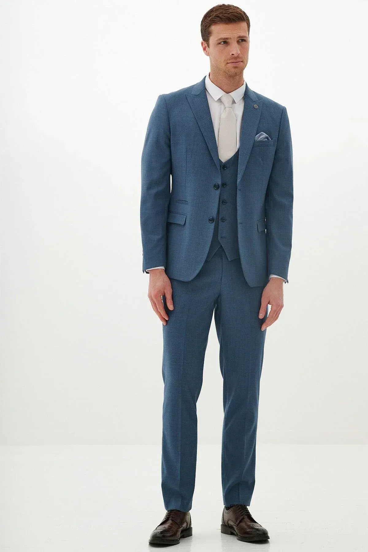 .Elevate your formal wardrobe with the Finley three piece suit in a striking teal blue shade, designed to make a refined statement at summer weddings and special occasions. Crafted from lightweight fabric, it offers exceptional breathability and comfort, allowing you to stay cool while maintaining a polished and sophisticated look. This suit features a tailored fit that enhances your silhouette, combining classic style with modern elegance. Whether attending a formal event or an important gathering, the Finley suit ensures you look impeccably sharp and confident throughout the day.