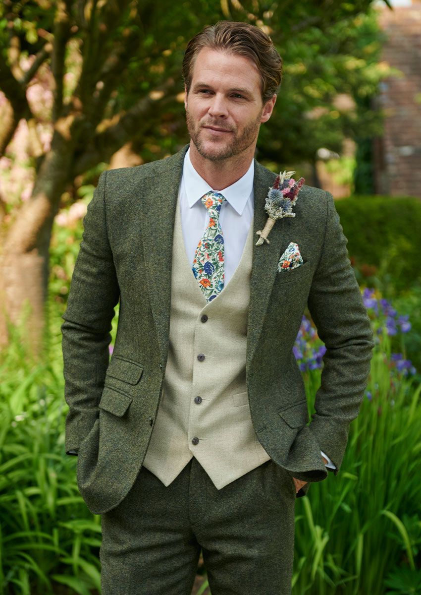 A Green Tweed suit available with matching waistcoat. This stunning 3 piece suit is the perfect alternate option for the fashion conscious groom..