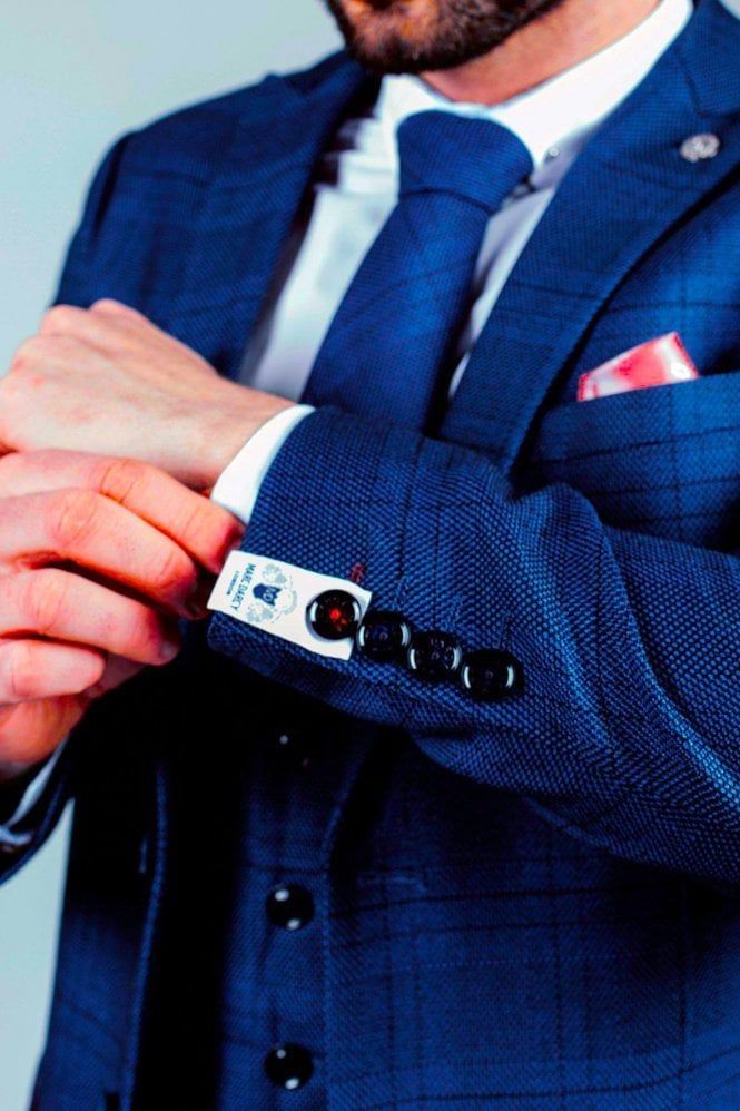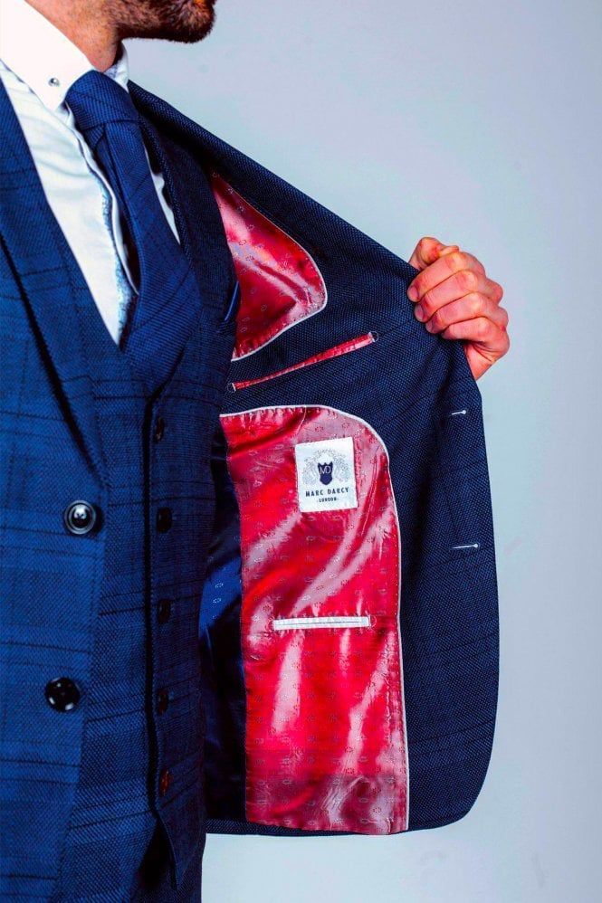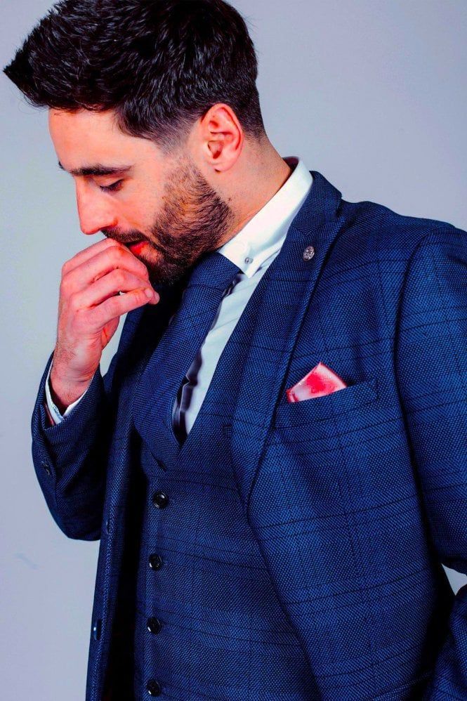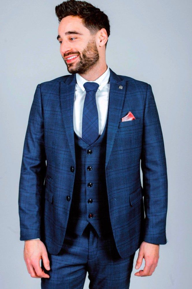 This Jerry suit is a traditional blue with a bit of a difference. It is enhanced with a subtle check running throughout and blush pink colour pop lining. The double back vents allow freedom of movement and the slim fit creates a perfectly contoured shape.
