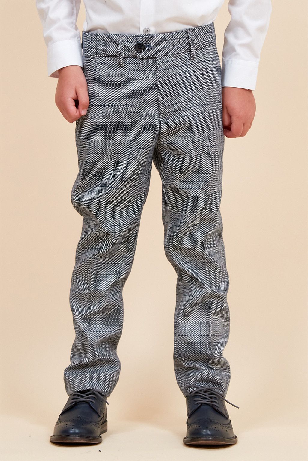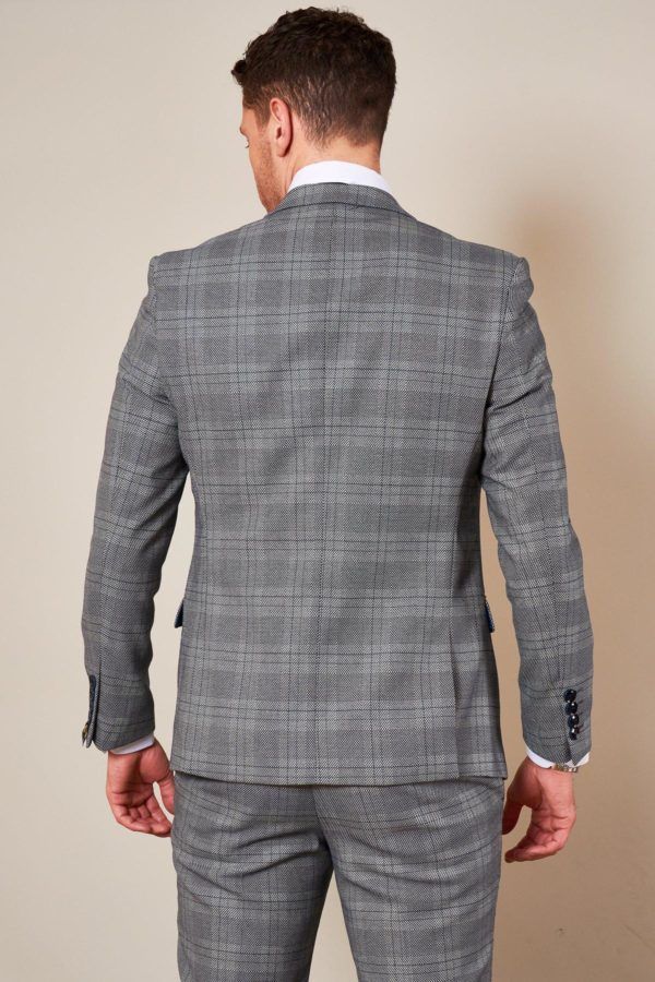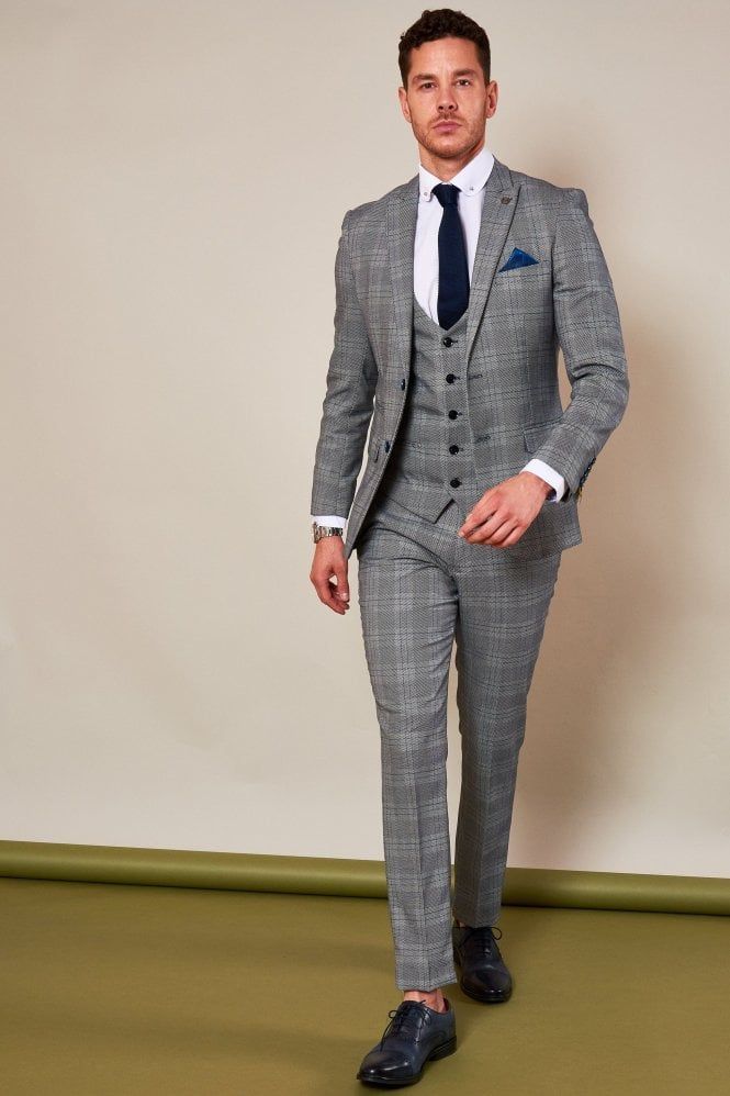 A grey suit with a difference, the Jerry three piece will make the 9-5 a little less tedious. It is enhanced with a subtle check running throughout and royal blue colour pop lining. The double back vents allow freedom of movement and the slim fit creates a perfectly contoured shape.