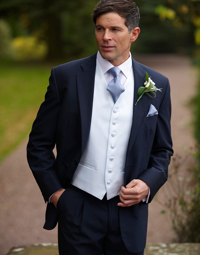 A modern Navy blue, lightweight mohair suit with matching trousers. Available with matching waistcoat if desired.