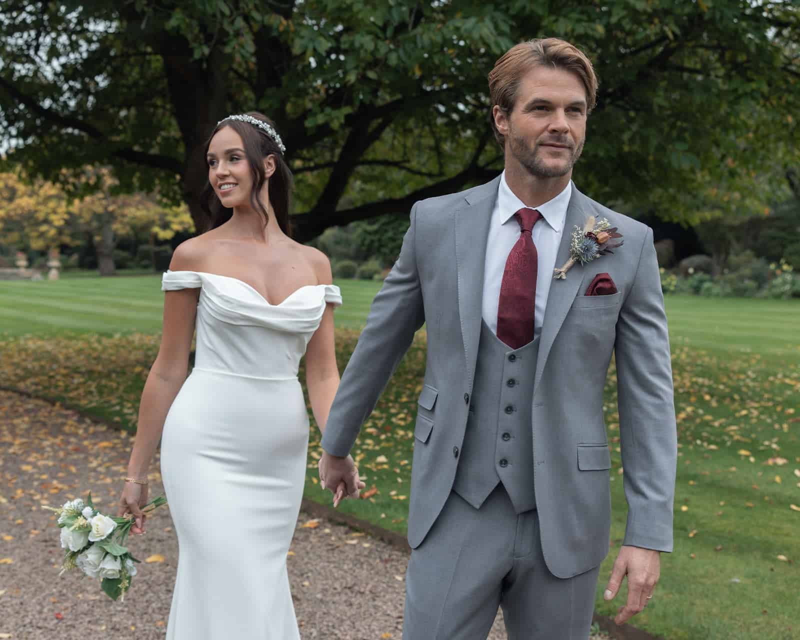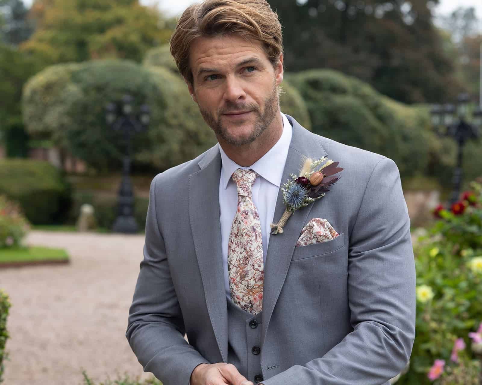 A light grey coloured, lightweight suit with matching trousers. Modern, lightweight and available with matching waistcoat if desired.