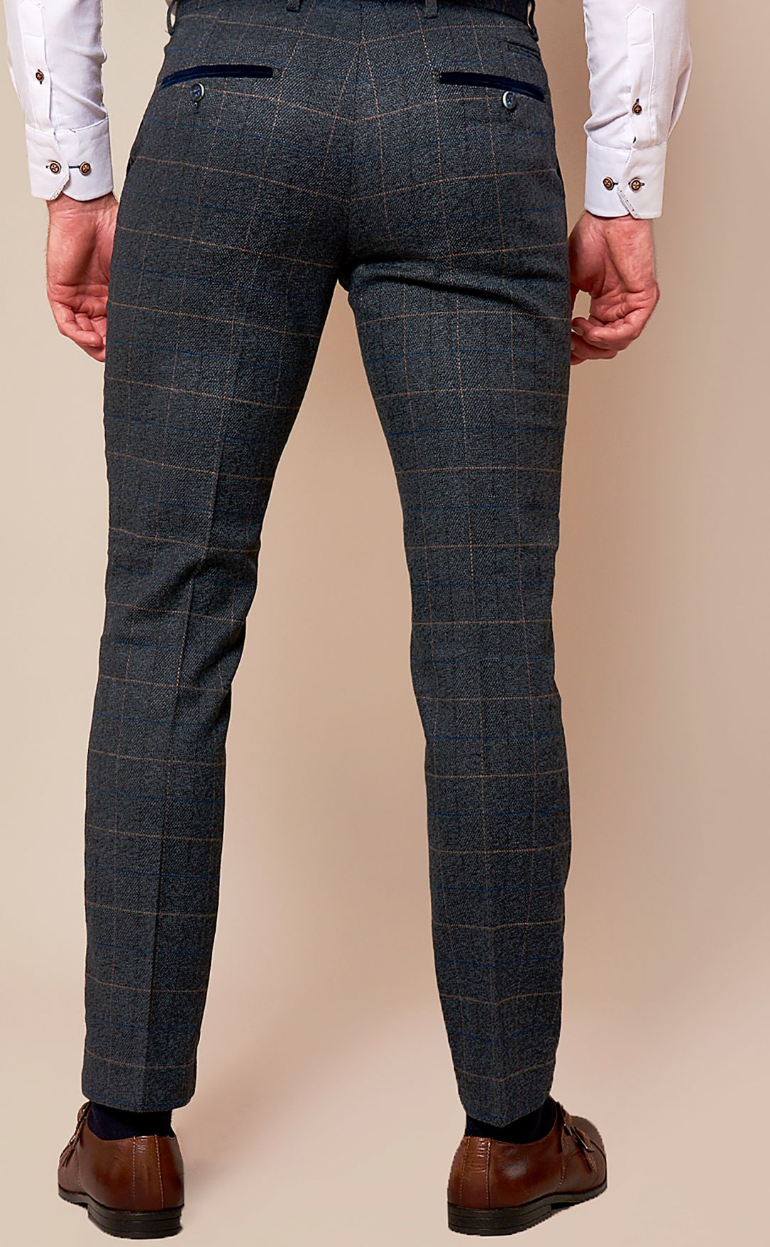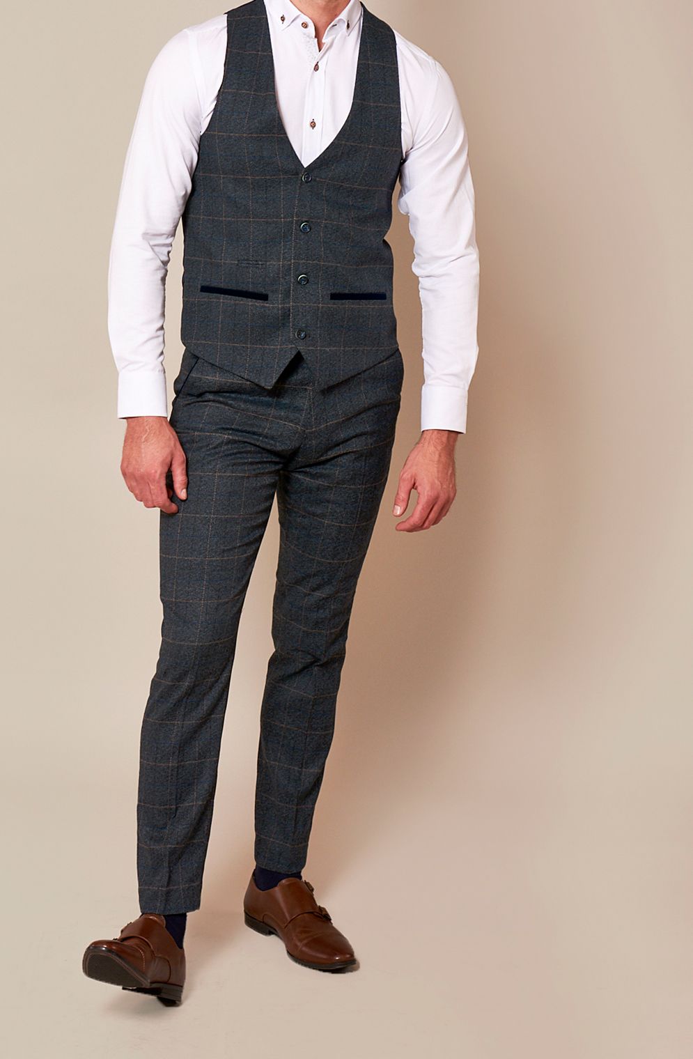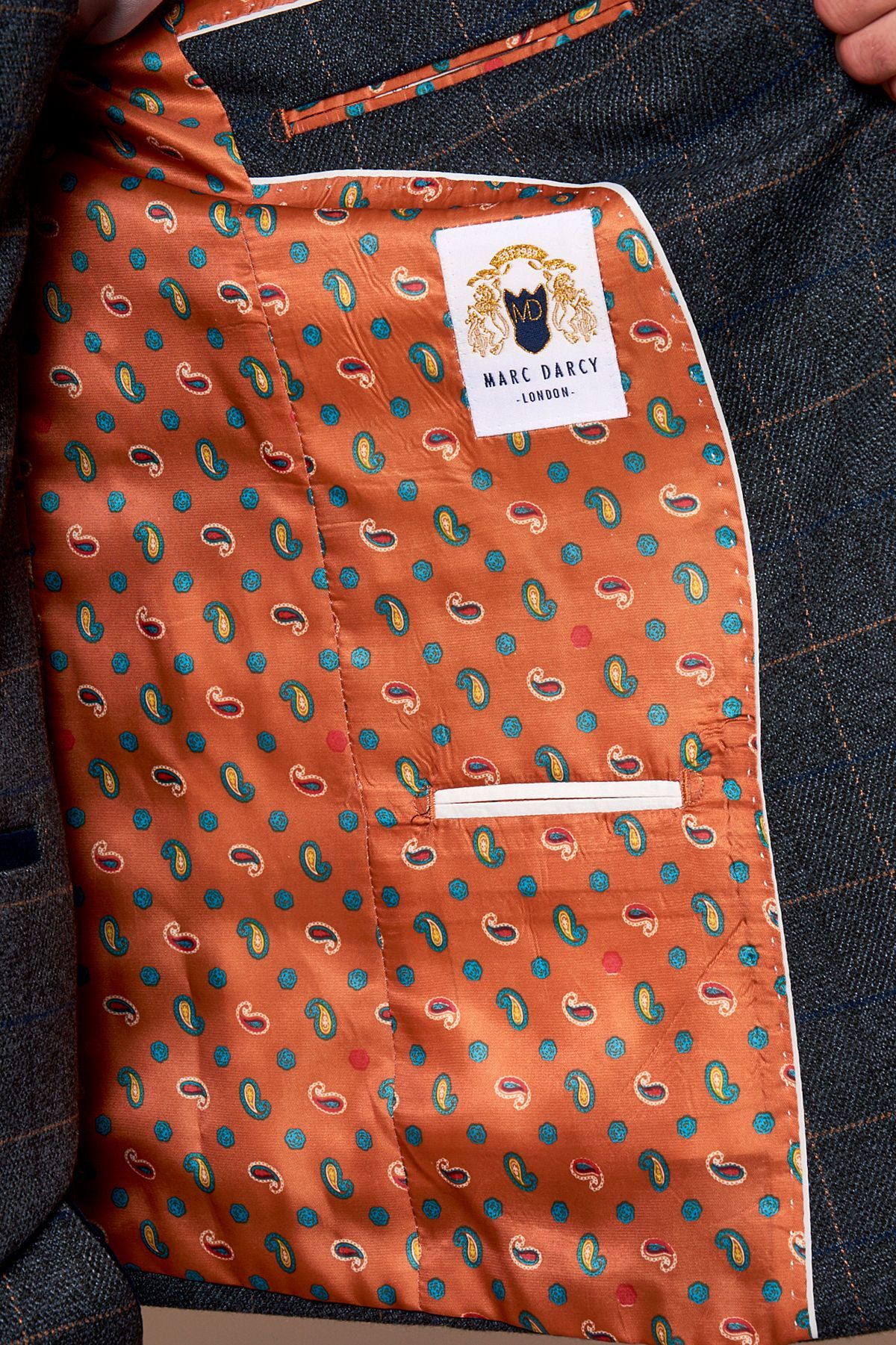 Character is added with the navy velvet contrast pocket trims and an eye-catching orange paisley pocket square peeking through the top pocket. Ideal for suave workwear and channeling Peaky Blinders.